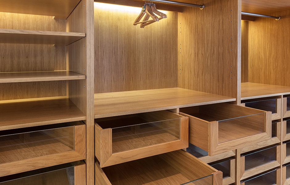 Una de las grandes ventajas de diseñar un armario a medida es que puedes configurar su interior a tu gusto. Te ayudamos a hacer tu armario lo más funcional y cómodo posible: perchas para pantalones, doble altura de barra o amplios cajones para facilitarte el día a día.